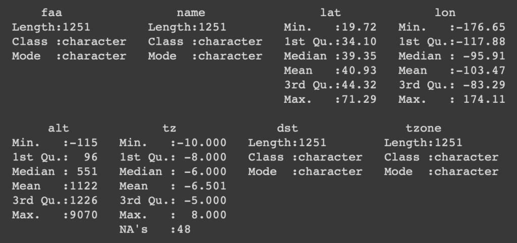 print(glue("Airports dataset have {round((1 - mean(complete.cases(airports)))*100,2)} % missing values."))
