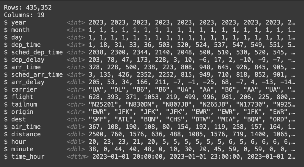 • nycflights23 เป็นการเรียก dataset ที่เกี่ยวกับ flights, planes, airports, weather, airlines ของ New York City ปี 2023 ทั้งหมด