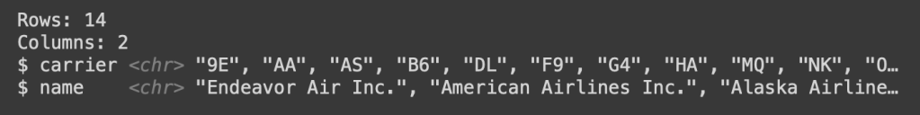 Airlines dataset ให้ข้อมูลต่างๆเกี่ยวกับชื่อสายการบินกับรหัสผู้ให้บริการ เราจะใช้สำหรับการดูรหัสและชื่อสายการบินที่เราจะใช้บริการ