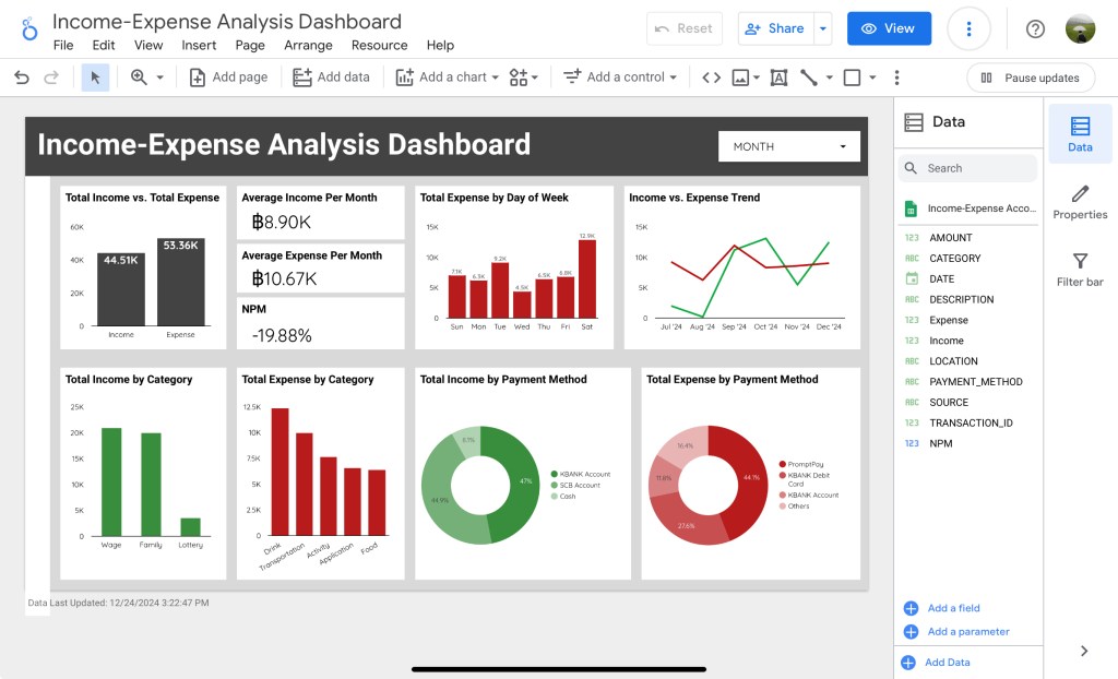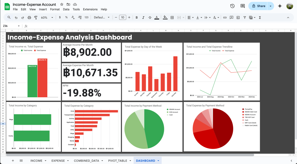 ดังนั้น dashboard ที่ได้ลงมือทำเป็นเพียงมอนิเตอร์ที่ track ให้เรารู้ว่าค่าใช้จ่ายในส่วนไหนน้อยหรือมาก เห็นแนวโน้มที่อาจจะเกิดขึ้นได้ สำคัญคือเราต้องปรับการใช้ชีวิตให้ค่าใช้จ่ายน้อยที่สุด และหาช่องทางที่เราจะสามารถหาเงินได้มากขึ้น