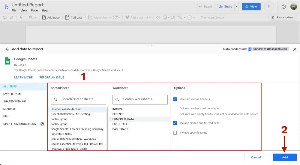 จากนั้นเราเลือกชีทที่เราจะใช้ทำเป็น dashboard