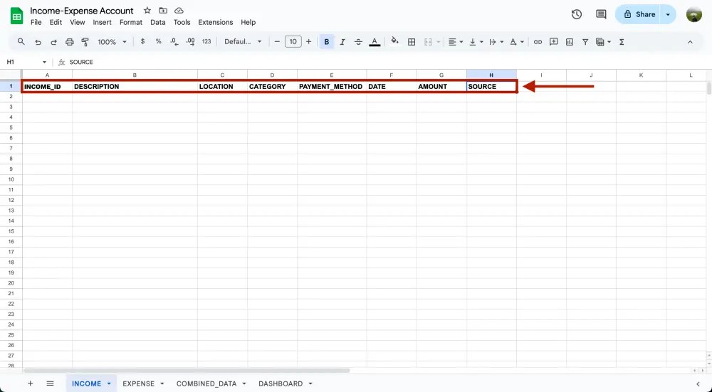 การตั้งชื่อ header ในบัญชีรายรับรายจ่ายสำคัญมากๆ เหมือนเราวางโครงสร้างบ้านเราให้มั่นคง ของเราจะสร้างทั้งหมด 8 header ให้กับชีท INCOME กับ EXPENSE ก่อน ทุกคนสามารถเพิ่มเติมจากนี้ได้นะ