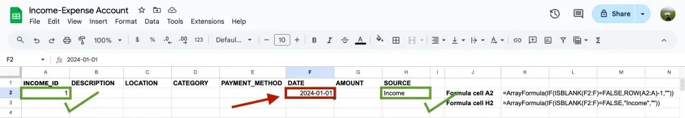 ทีนี้เราลอง test ว่าใช้ได้จริงมั้ย โดยการพิมพ์วันที่ใน cell F2 ดูกัน ถ้า cell A2 ขึ้นเป็นเลข 1 และ cell H2 ขึ้นเป็นคำว่า Income แสดงว่าใช้ได้