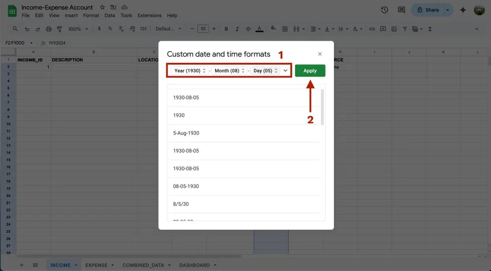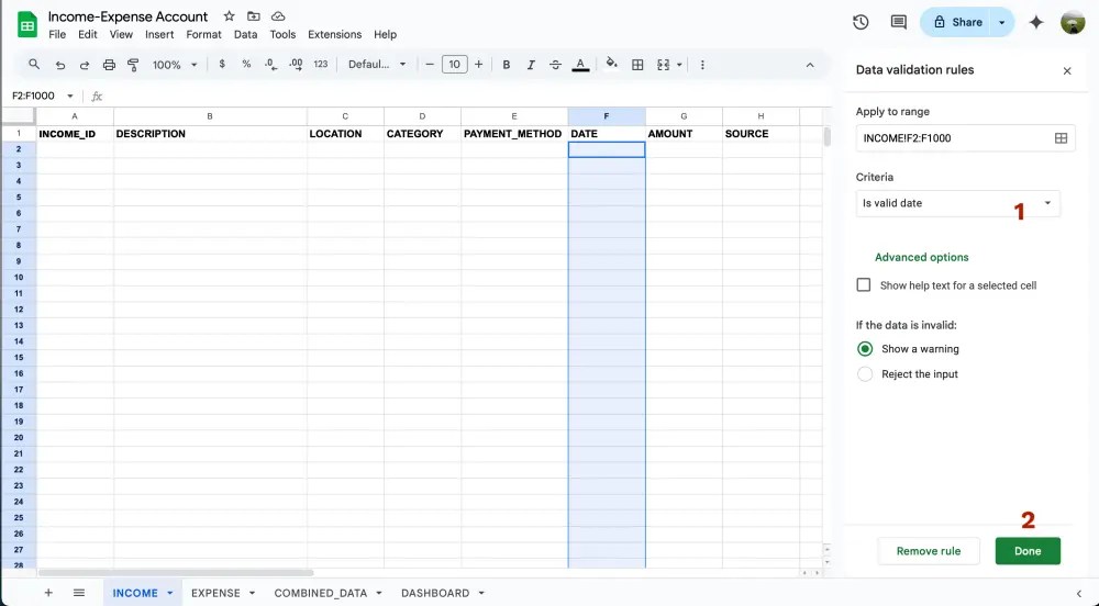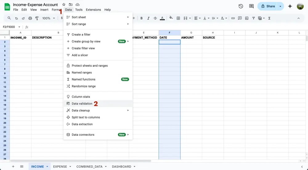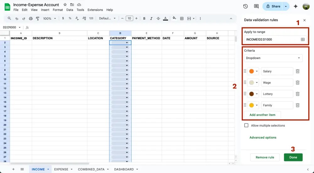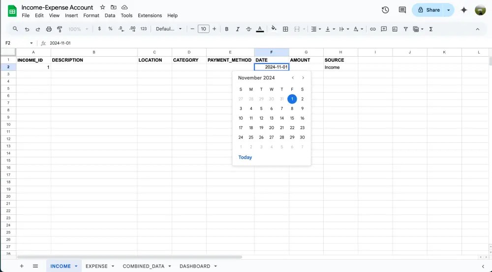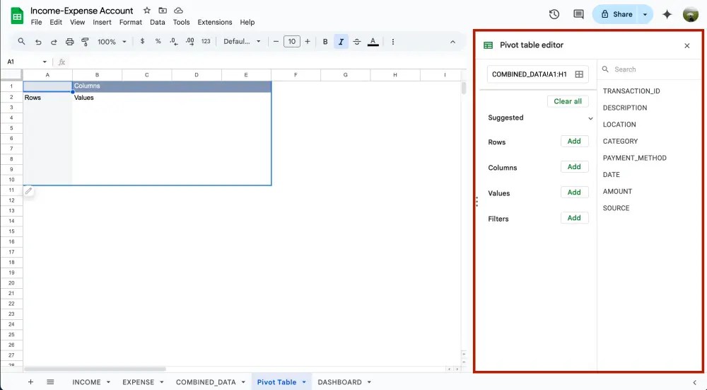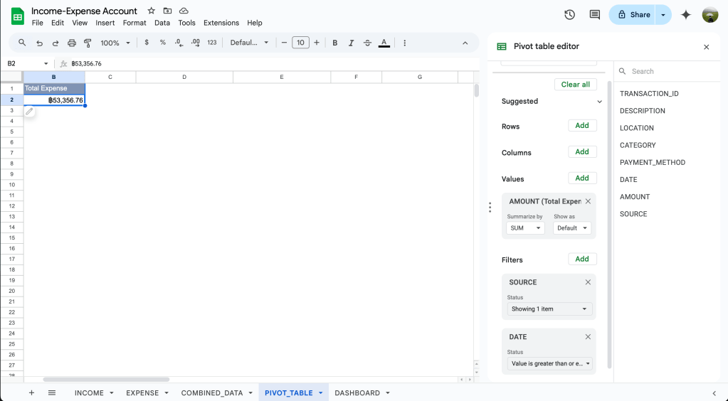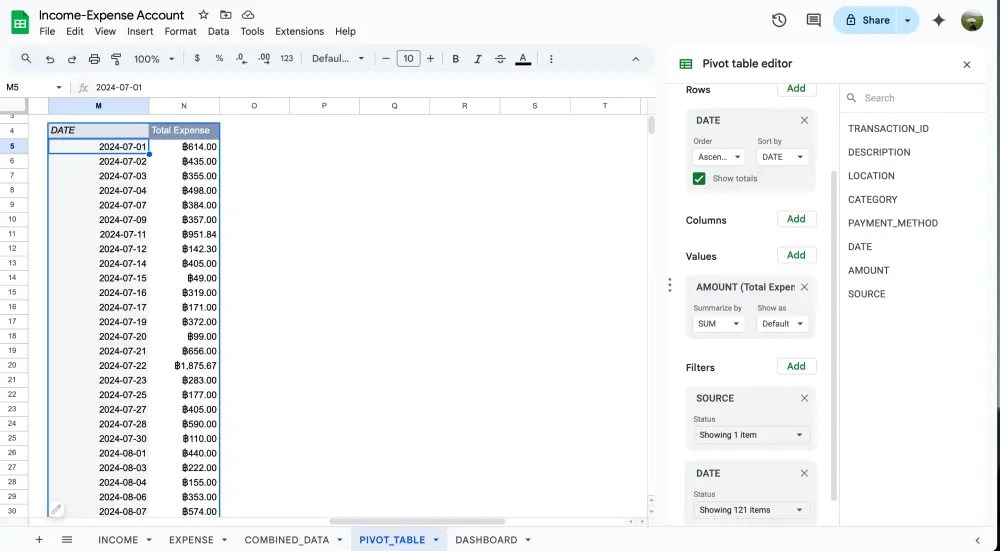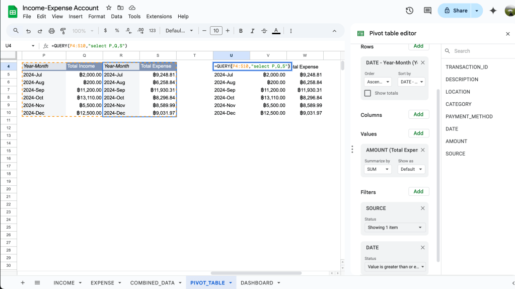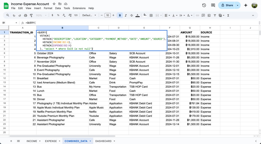 เท่านี้เวลามีข้อมูลใหม่ๆเข้ามาจากชีท INCOME และ EXPENSE ในชีท COMBINED_DATA จะถูก update ให้อัตโนมัติเลย