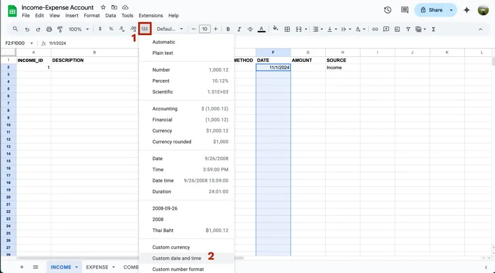 ให้ทุกคน highlight cell F2 เป็นต้นไปเหมือนเดิม จากนั้นสังเกตที่แถบเครื่องมือคลิกที่ 123 (More formats) > Custom date and time