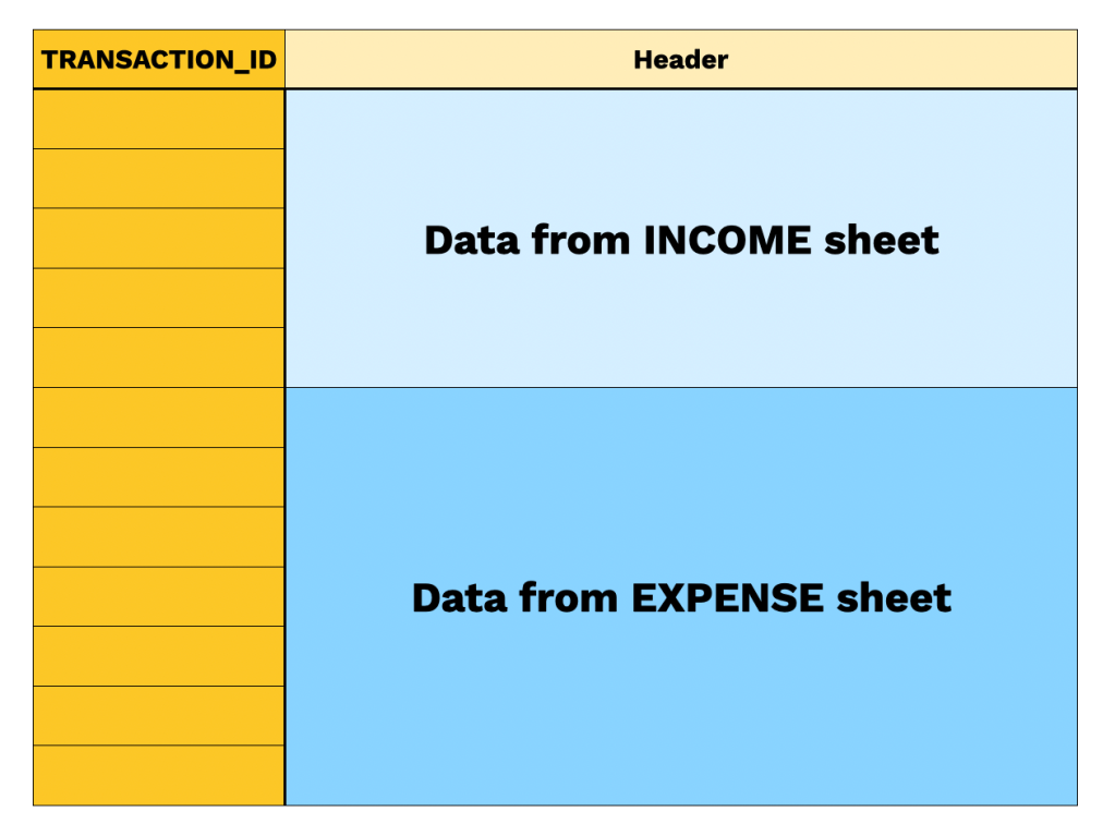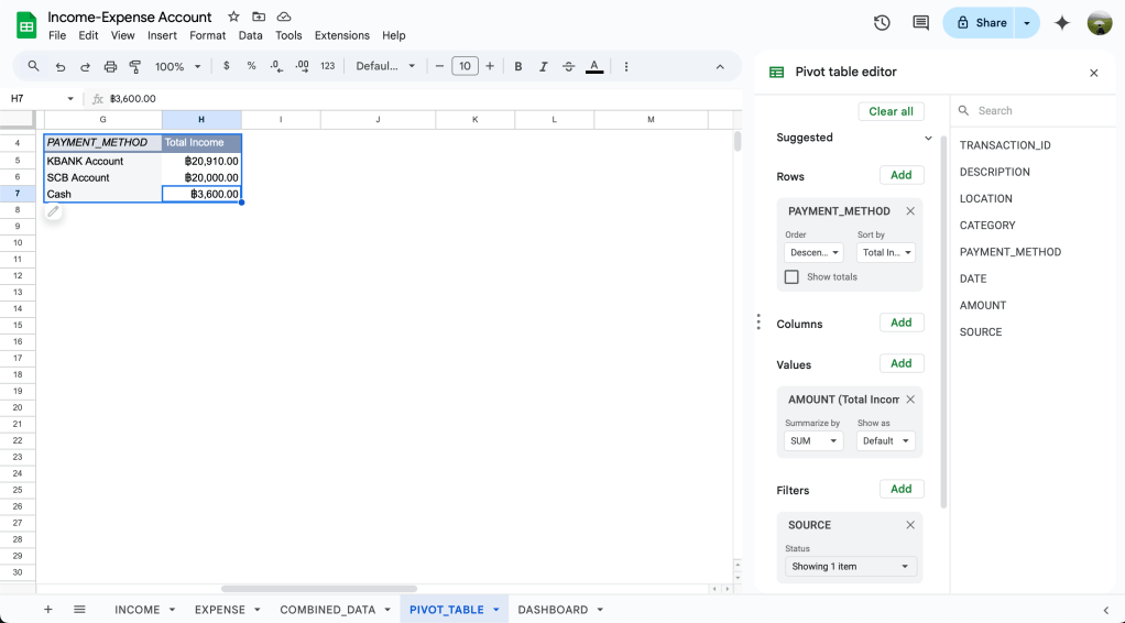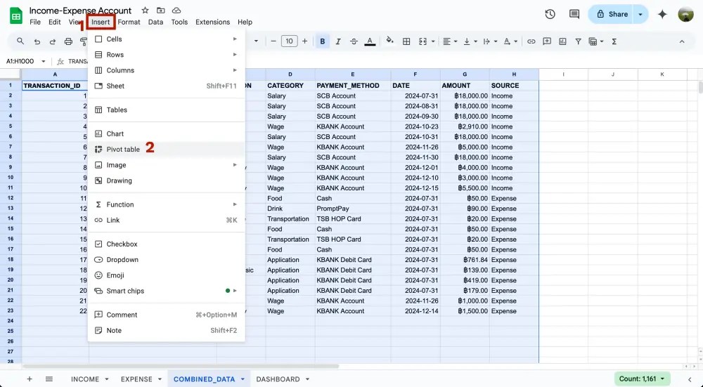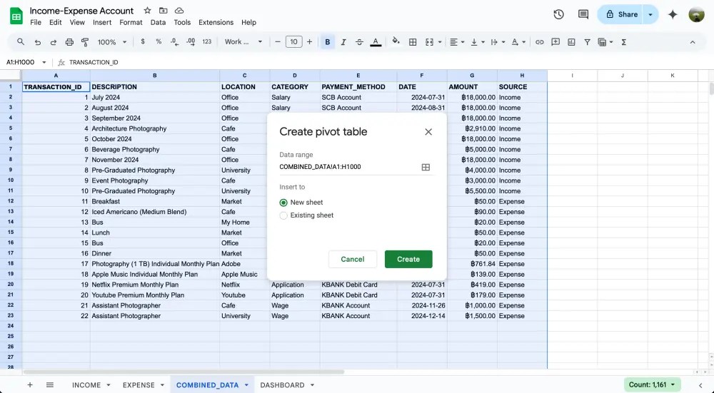 เราจะ combine data ทั้งรายรับและรายจ่ายเข้าด้วยกันเป็น 1 sheet เพื่อที่เราจำสามารถสร้าง pivot table ที่นำตัวเลขรายรับ-รายจ่ายมาคำนวณได้
