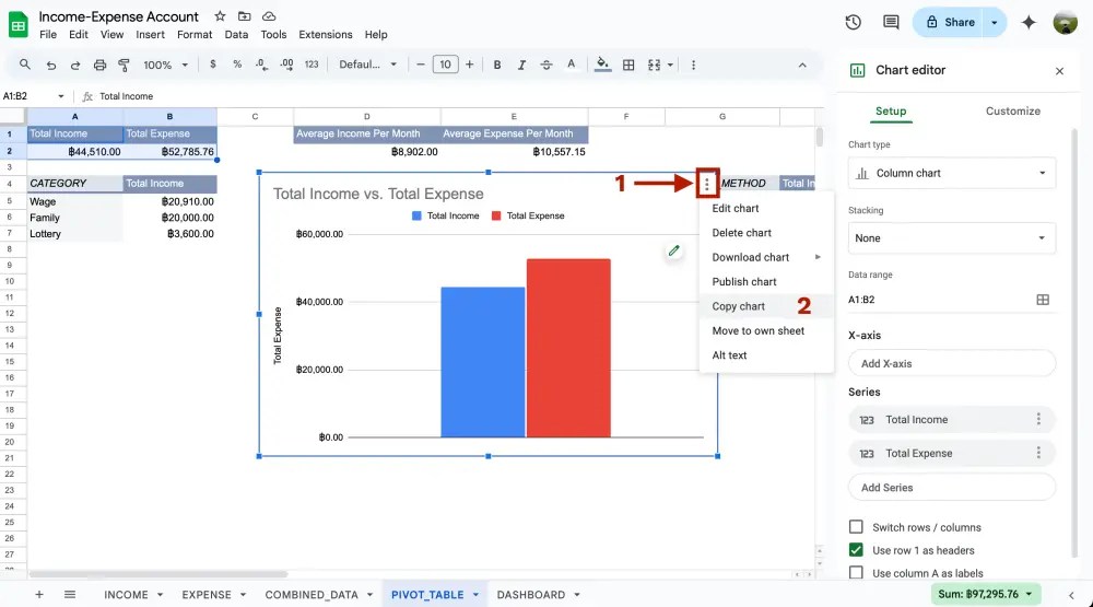 ให้เรากดสัญลักษณ์ 3 จุดที่มุมขวาของ chart แล้วเลือก Copy chart จากนั้นก็ลบ chart ในหน้าชีท PIVOT_TABLE ได้เลย