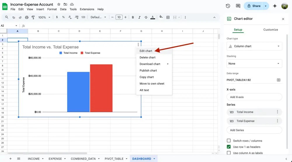 สังเกตว่า chart ของเราจะอยู่ในชีท PIVOT_TABLE แต่เราอยากได้ไปโชว์ในชีท DASHBOARD ใช่มั้ย