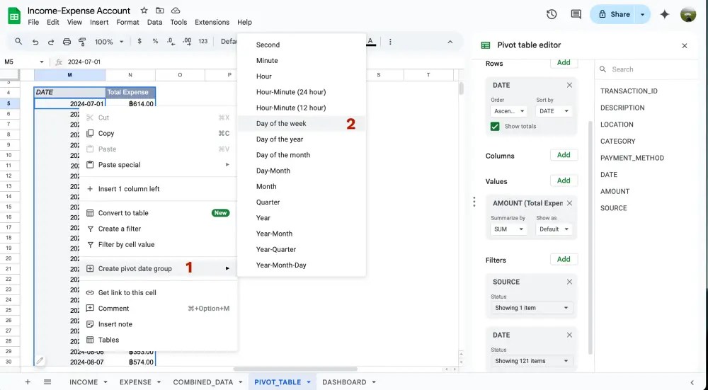 จากนั้นคลิกขวาตรงไหนก็ได้ในคอลัมน์ DATE แล้วเลือก Create pivot date group > Year-Month