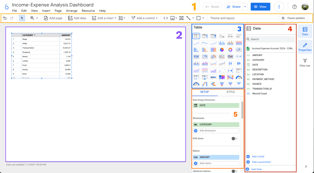 5. โซนสีส้ม เป็นโซนที่เราลาก features จากโซนสีแดงมาใส่ที่ Dimension กับ Metric เพื่อสร้าง chart เหมือนกับการสร้าง pivot table ใน Google Sheets เลย และมีไว้ปรับแต่ง chart ของเรา